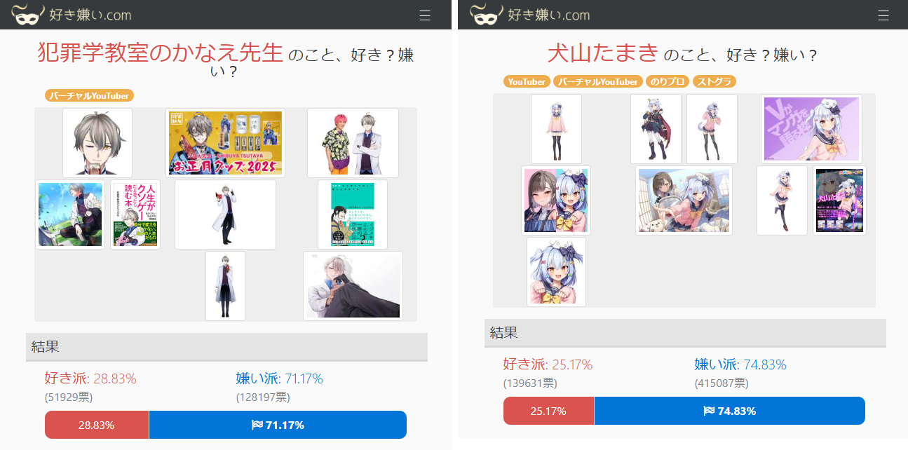 | … | 70無念Nameとしあき25/11/20(木)12:02:17No.1367405519+>vtuberはなかなか嫌い派が50%超えないのに… |
