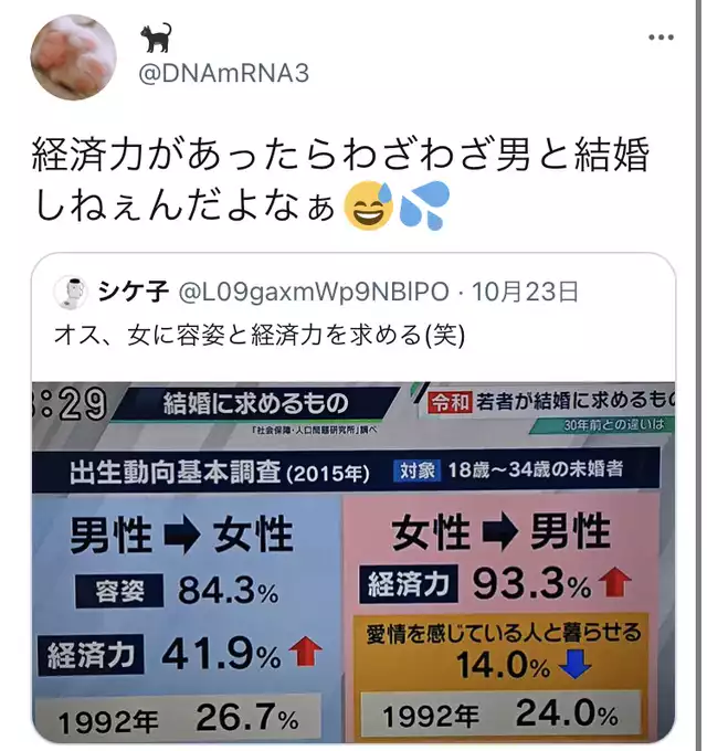 | … | 940無念Nameとしあき25/11/20(木)16:06:44No.1367445250そうだねx6>男がもてないから以前の問題な気がするがね |