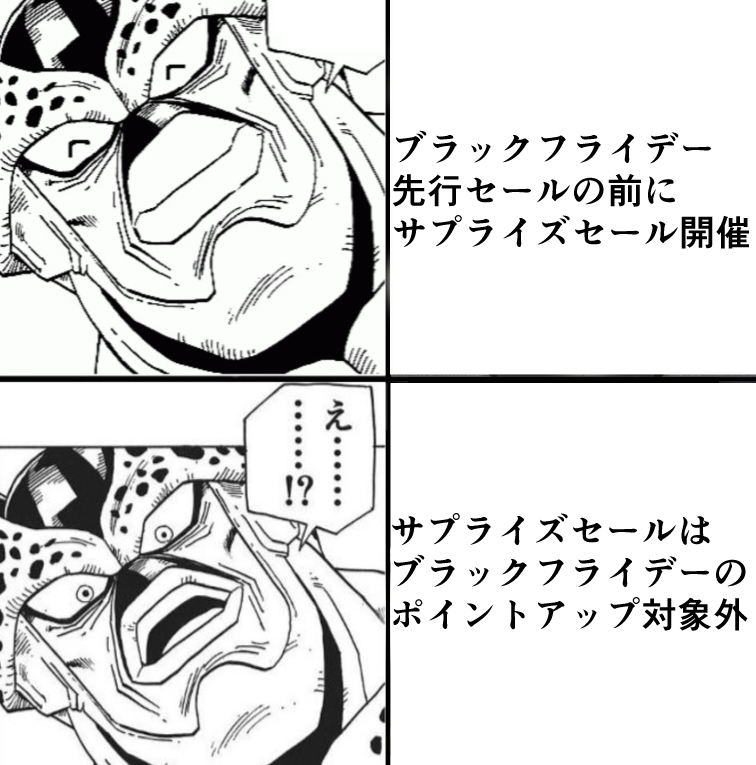 | … | 369無念Nameとしあき25/11/20(木)17:00:05No.1367453261そうだねx4 1763625605797.png-(928057 B) ブラックフライデーのポイントが付かないのにブラックフライデー名乗ったら駄目でわサプライズセール |