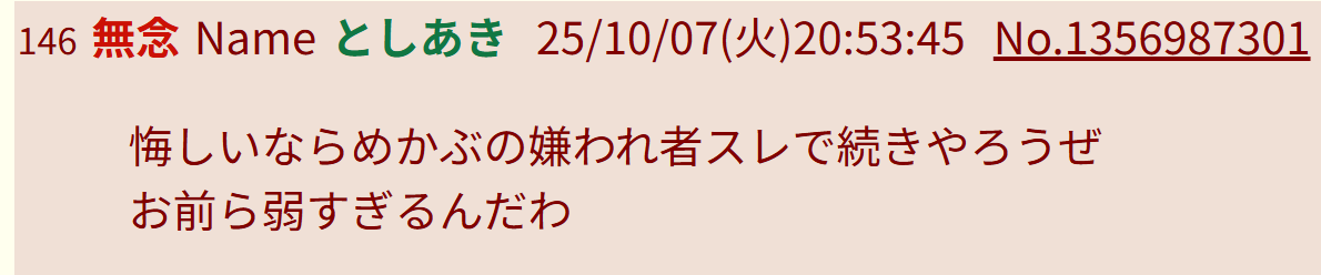 … | 24無念Nameとしあき25/10/07(火)20:47:37No.1356985353+よわよわスレ豚 |
