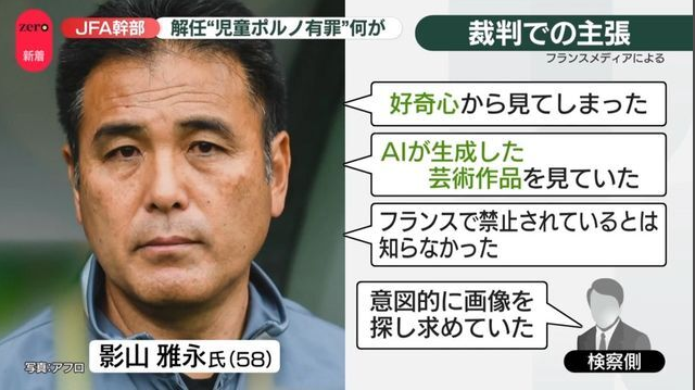 … | 57無念Nameとしあき25/10/07(火)23:19:09No.1357030081そうだねx2日本サッカー協会・影山雅永氏、フランスで児童ポルノ画像を所持した罪で逮捕・有罪判決 |