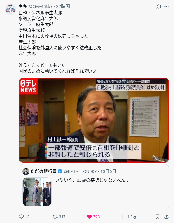 … | 243無念Nameとしあき25/10/08(水)20:21:56No.1357202517+麻生の、麻生による、麻生家のための政治 |