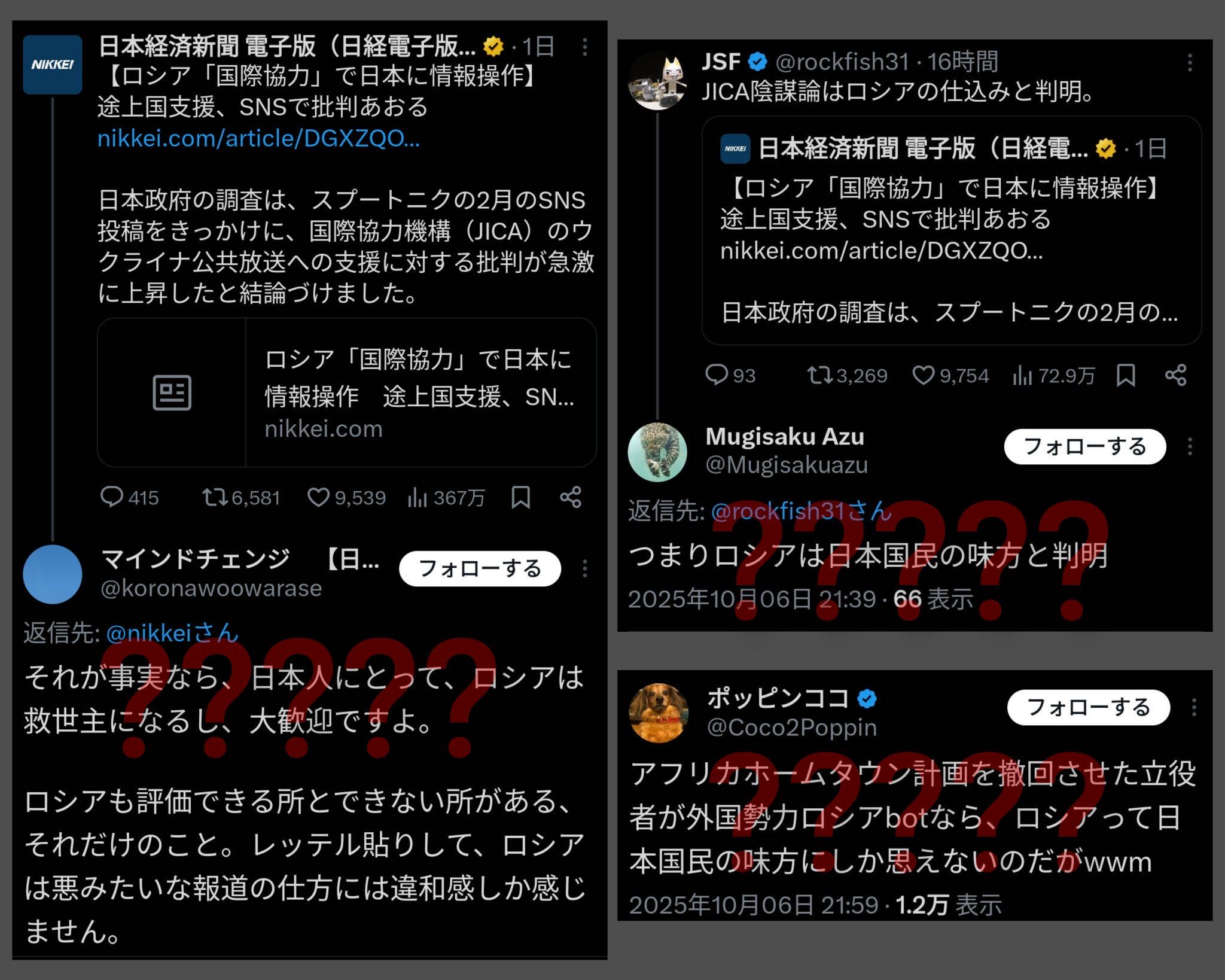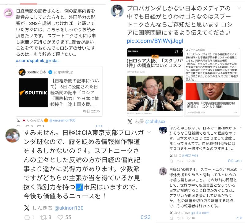 … | 4無念Nameとしあき25/10/08(水)16:57:54No.1357154471そうだねx8スプートニク日本はX(旧ツイッター)で、「ODA(政府開発援助)控えるべきだ」(4月7日)、「海外支援なんか全部やめて国内に」(同9日)といった意見を、日本国民の声であるかのように紹介する投稿を繰り返した。こうした投稿は、親露的な主張を展開するアカウントによってSNSで拡散された。 |