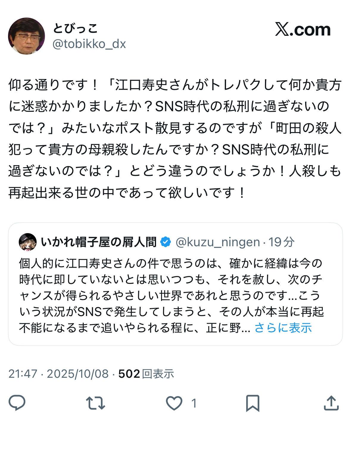 … | 948無念Nameとしあき25/10/08(水)22:51:38No.1357247380そうだねx1>このツイートが炎上の発端だったの? |