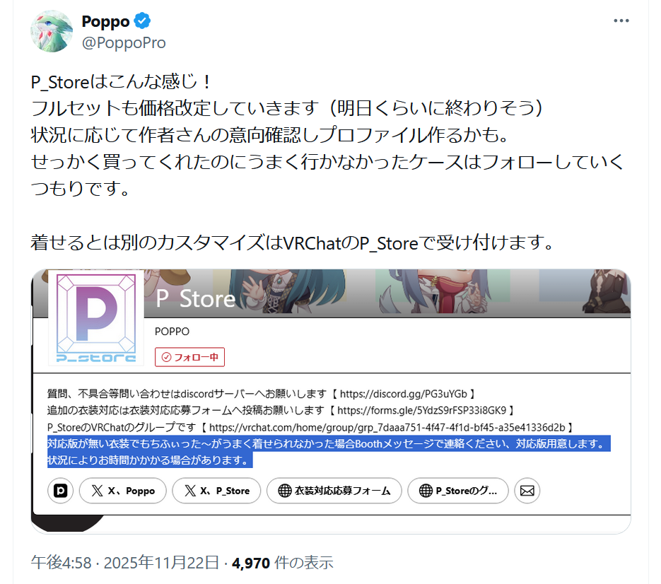| … | 20無念Nameとしあき25/11/22(土)18:54:14No.1367938206+非対応衣装の対応化禁止掲げる衣装屋が現れたからめんどくさいからリスト化してるけどめんどくさいな |