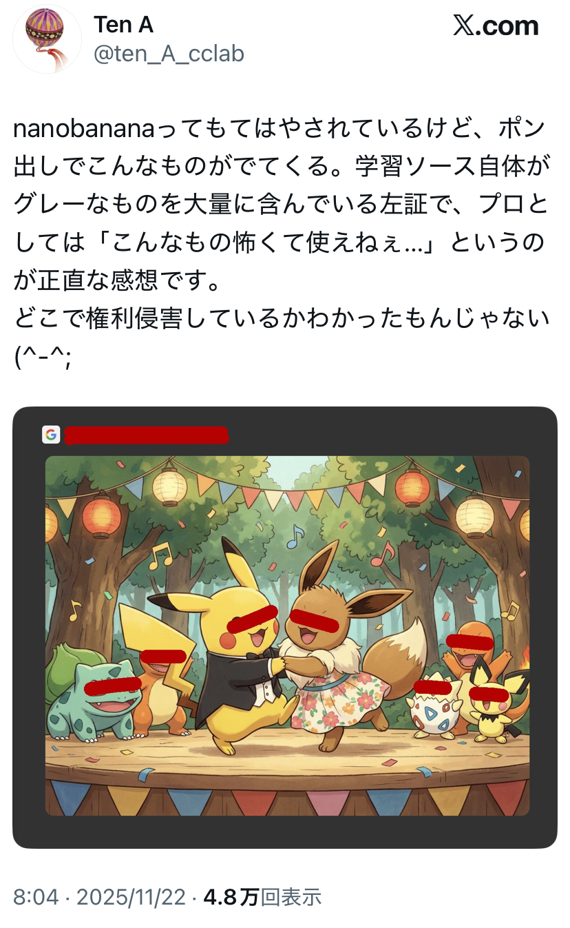 | … | 124無念Nameとしあき25/11/22(土)19:26:34No.1367946699+>出力に意図がなくてもそれを商用に利用すればアウトだがな |