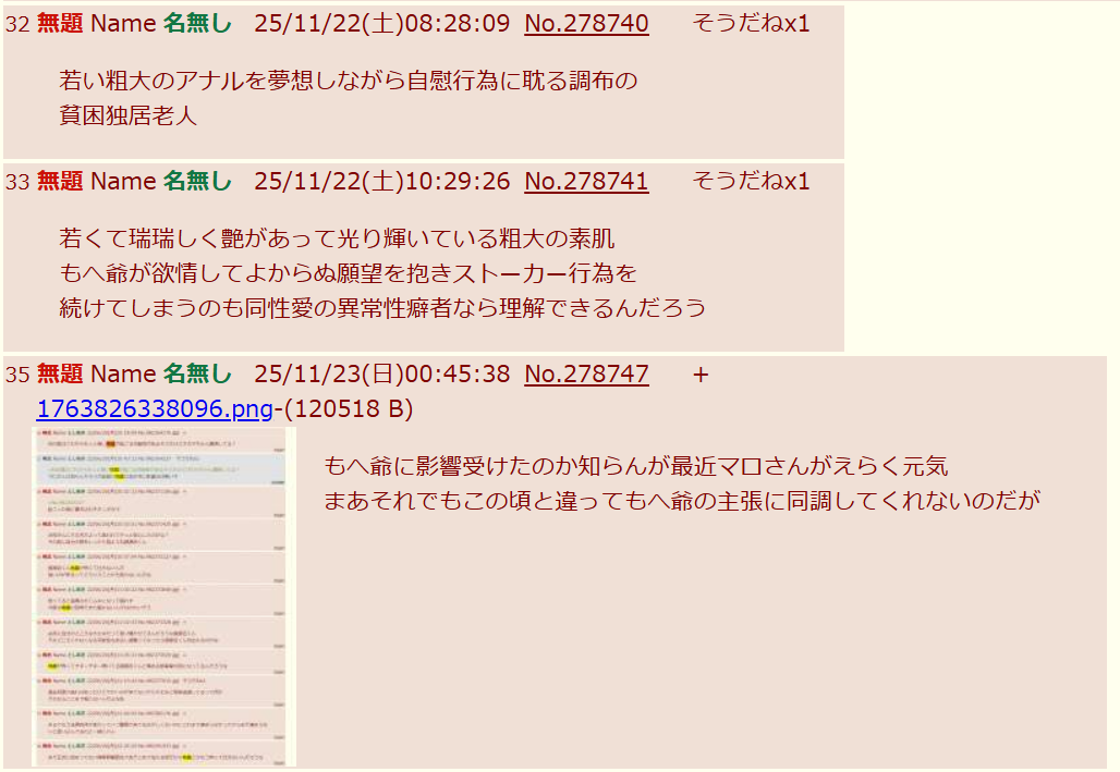 | … | 24無念Nameとしあき25/11/23(日)01:00:10No.1368036181+>やっぱり他所の板に逃げて泣いてんな |