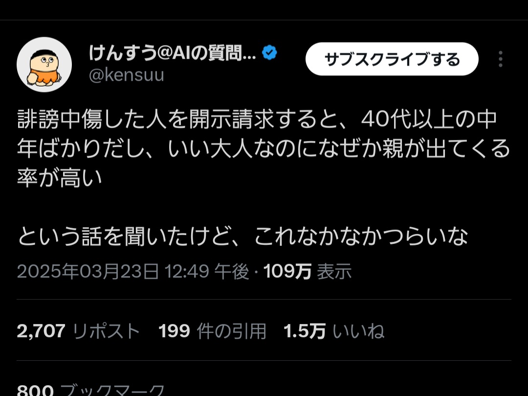 | … | 96無念Nameとしあき25/11/23(日)13:50:28No.1368137865+>まあそもそもいい歳して妻子持ちならネットで誹謗中傷したりしないよね普通は |