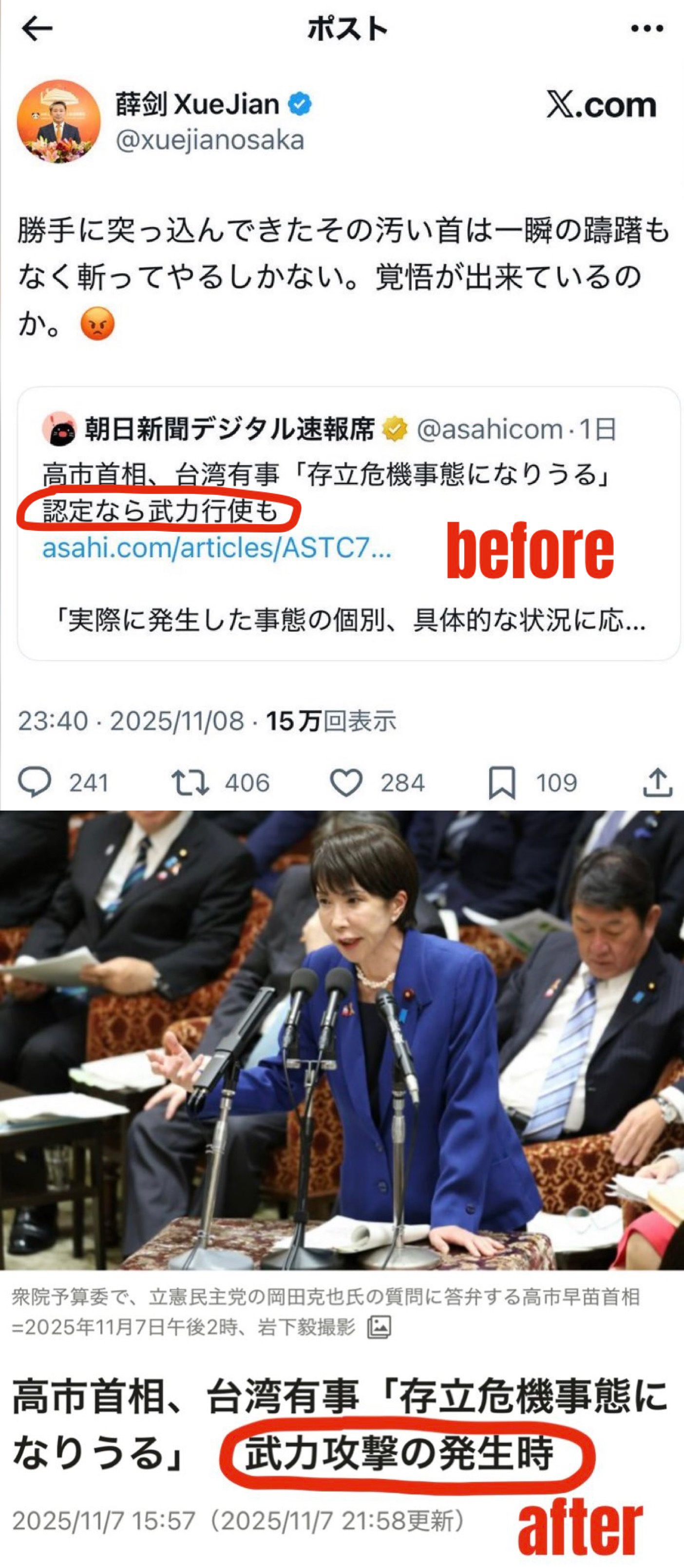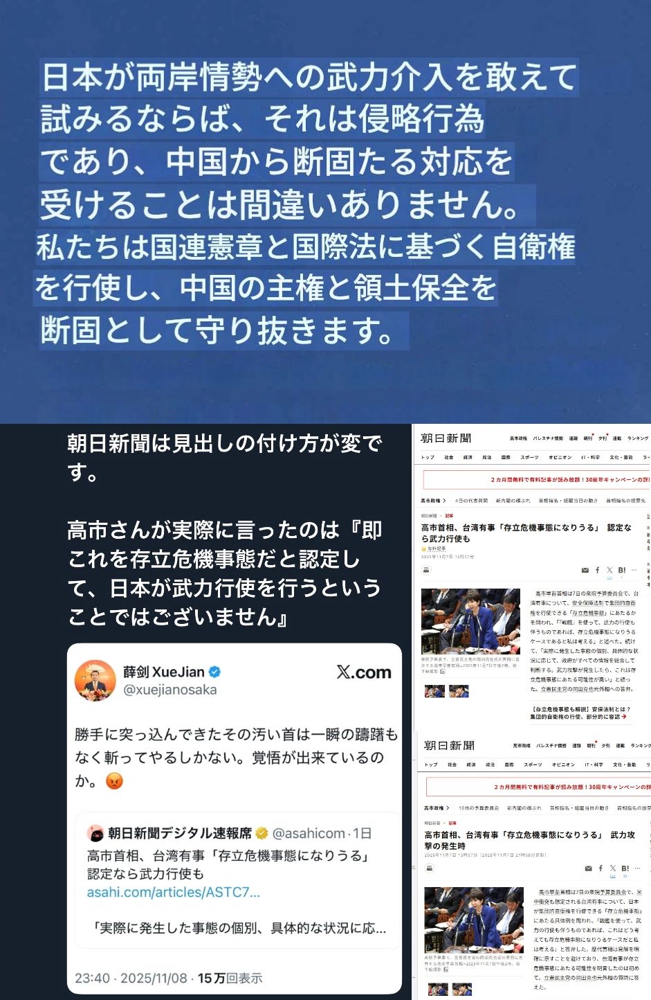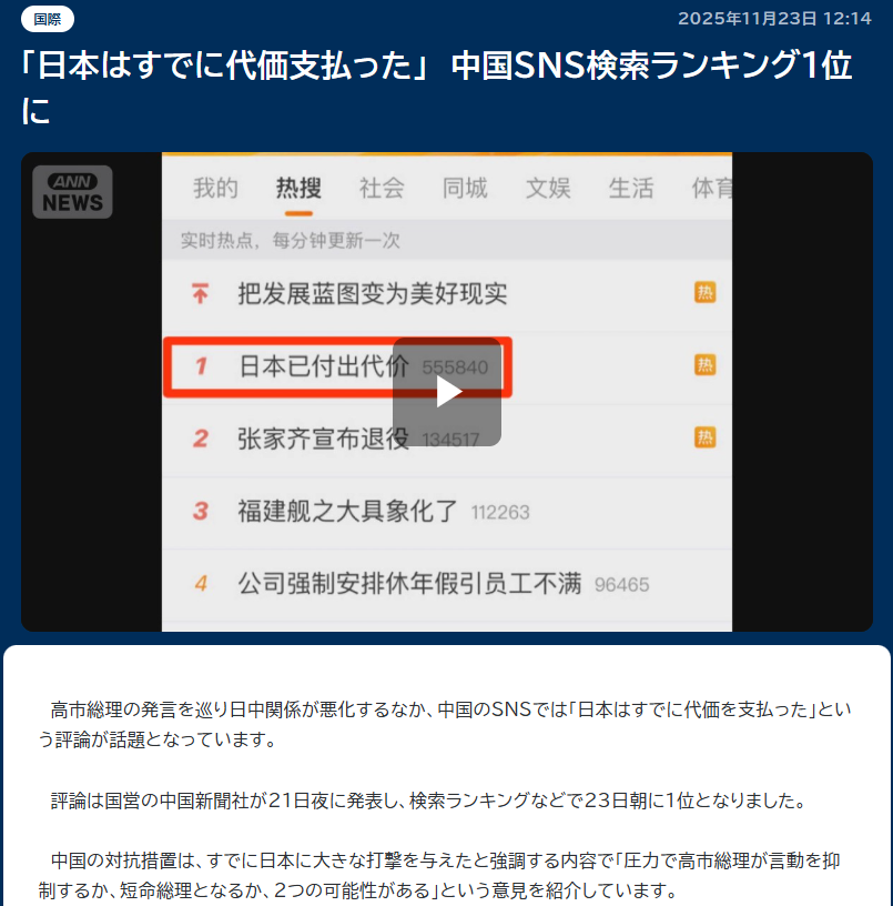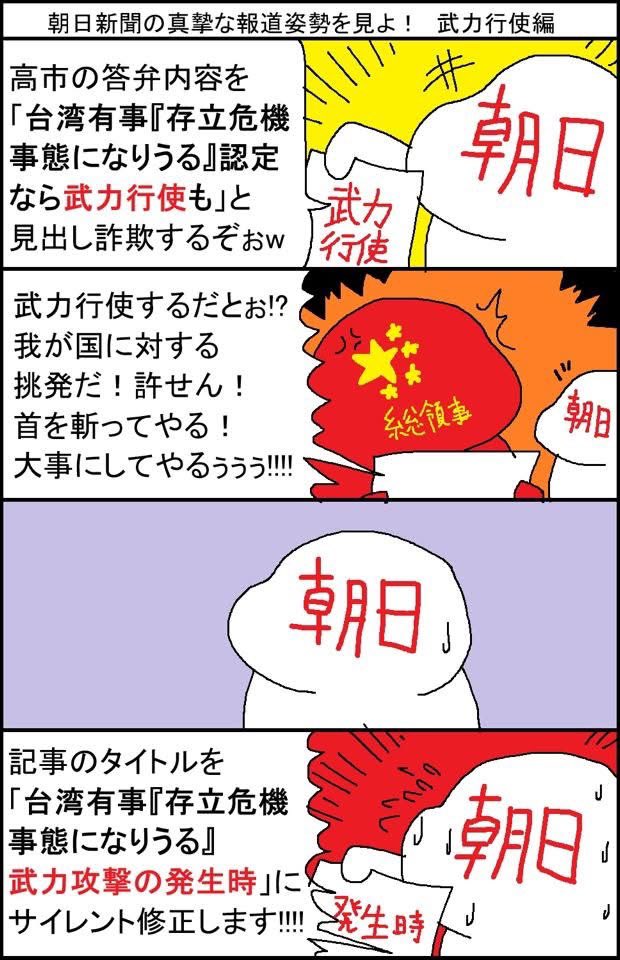 | … | 943無念Nameとしあき25/11/23(日)18:06:37No.1368200355+中国「朝日新聞の記事に書いてあったアル!日本が中国に武力行使するって脅してきたアル!」 |