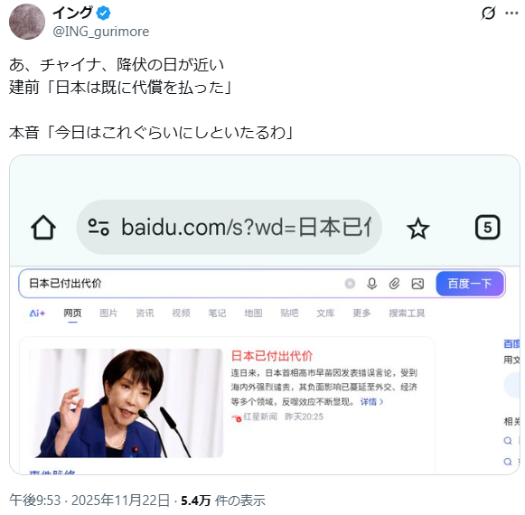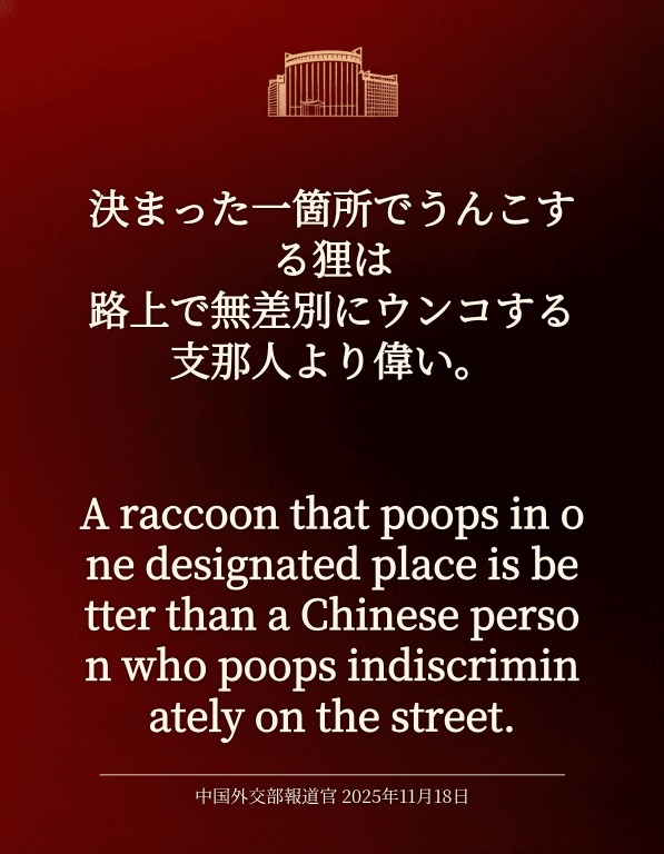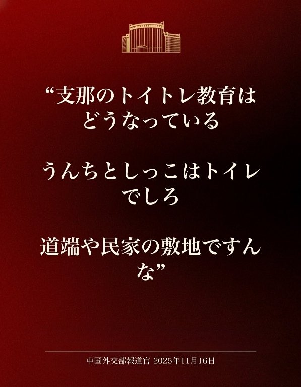 | … | 55無念Nameとしあき25/11/23(日)16:20:48No.1368171926そうだねx3中国のバカ大使またやらかしてるな |