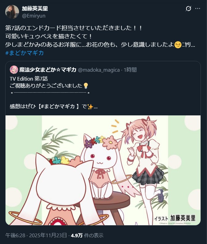 | … | 742無念Nameとしあき25/11/23(日)21:56:41No.1368269774そうだねx2当時みたいに毎週まどマギについてまた語れるようになるとはこのリハク |