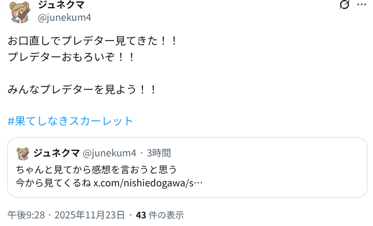 | … | 910無念Nameとしあき25/11/23(日)22:04:51No.1368272429そうだねx2スカーレットは好きって言うのはいると思うぞ |