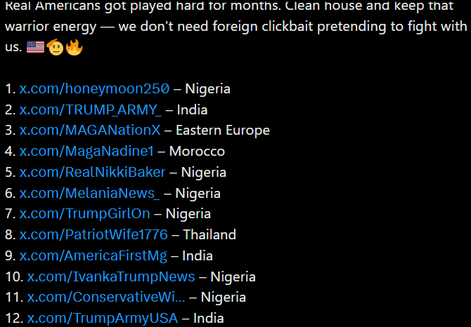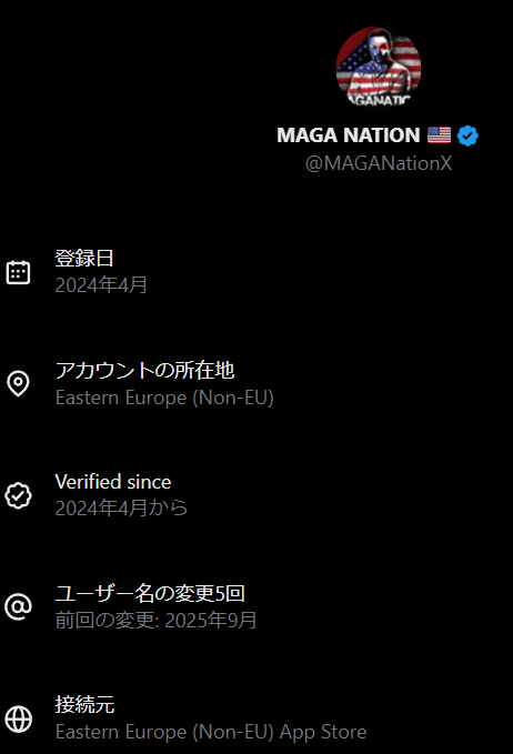 | … | 362無念Nameとしあき25/11/24(月)01:05:22No.1368317124+機能が公開されると同時に、対立する勢力が相手陣営の所在地を一斉にチェックし始め、MAGA系や右派の大物インフルエンサーアカウントが数十件も海外(外国)から運用されていることが次々と発覚しました。 |