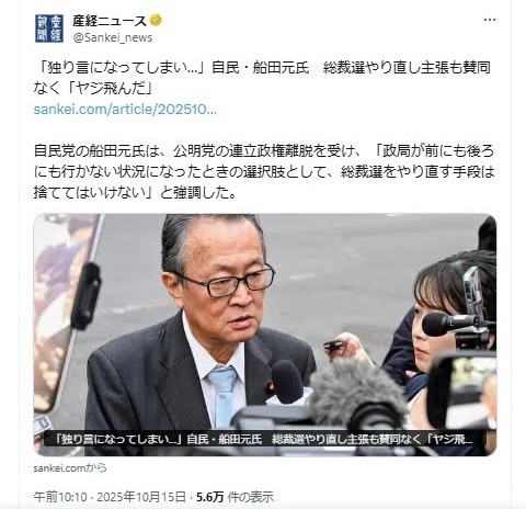 | … | 29無念Nameとしあき25/11/23(日)20:52:32No.1368247385そうだねx77>バカすぎるだろ自民 |