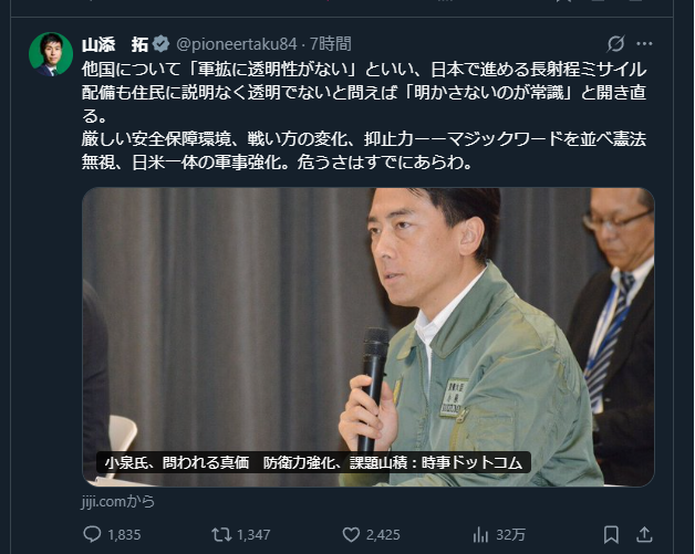 | … | 1無念Nameとしあき25/11/23(日)20:43:43No.1368244545そうだねx4920日の外交防衛委員会で、小泉氏に対し、共産党の山添拓政策委員長が弾薬の数や配備について質問したことも例に挙げ「そんなこと言うわけないじゃないですか」と説明。「安全保障の政策っていうのは全てを明らかにすることが相手に対して手の内を見せてしまうことになりかねんだ。それは日本にとっての利益にならないんだっていうこういったこともやはり分かりやすく伝えていく」とした。 |