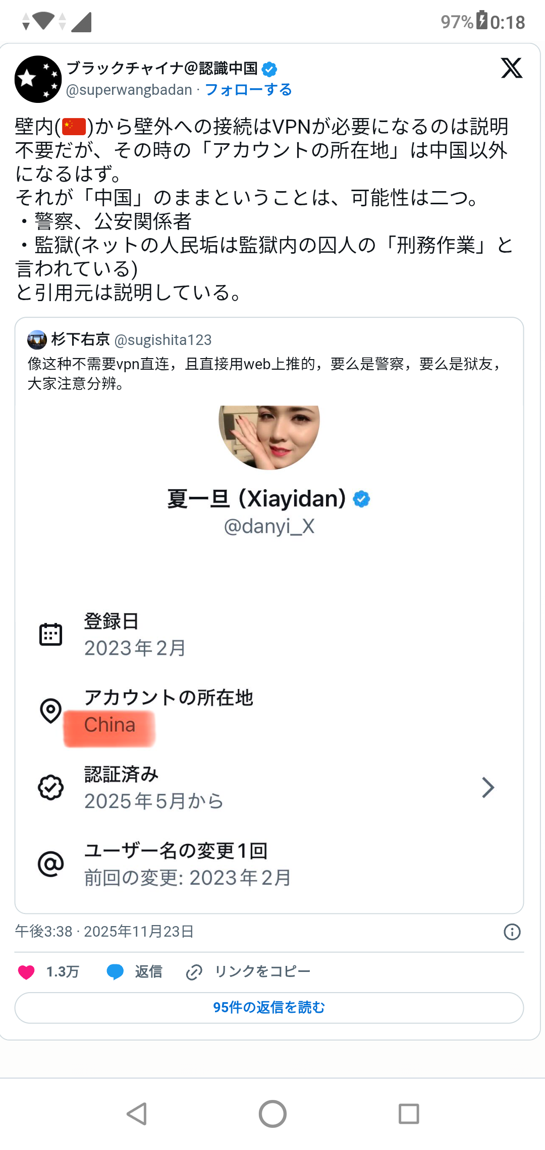 | … | 63無念Nameとしあき25/11/24(月)00:08:01No.1368305788+>中国からXってVPN通しても見れないんじゃないっけ? |