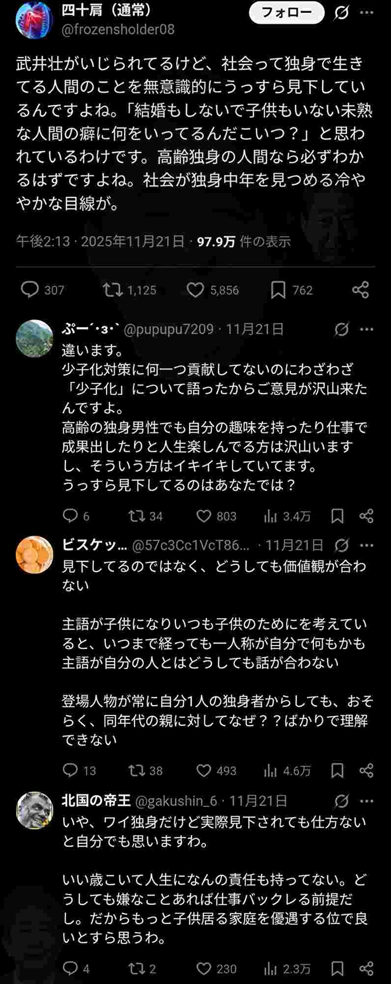 | … | 27無念Nameとしあき25/11/24(月)08:07:27No.1368342644そうだねx4>40代50代の底辺労働者は独身だらけだぞ |