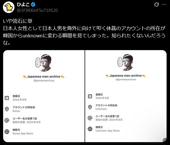| … | 31無念Nameとしあき25/11/24(月)08:57:33No.1368348735そうだねx9>>一方で、海外駐在を名乗るユーザーがなぜか日本と表示されるケースも確認されており、所在地を推定するアルゴリズムが必ずしも正しく機能していない可能性が指摘されている。これにより、「信頼性向上のための仕組み」として導入された機能が、かえって不信感や疑念を呼び起こす結果になっている。 |