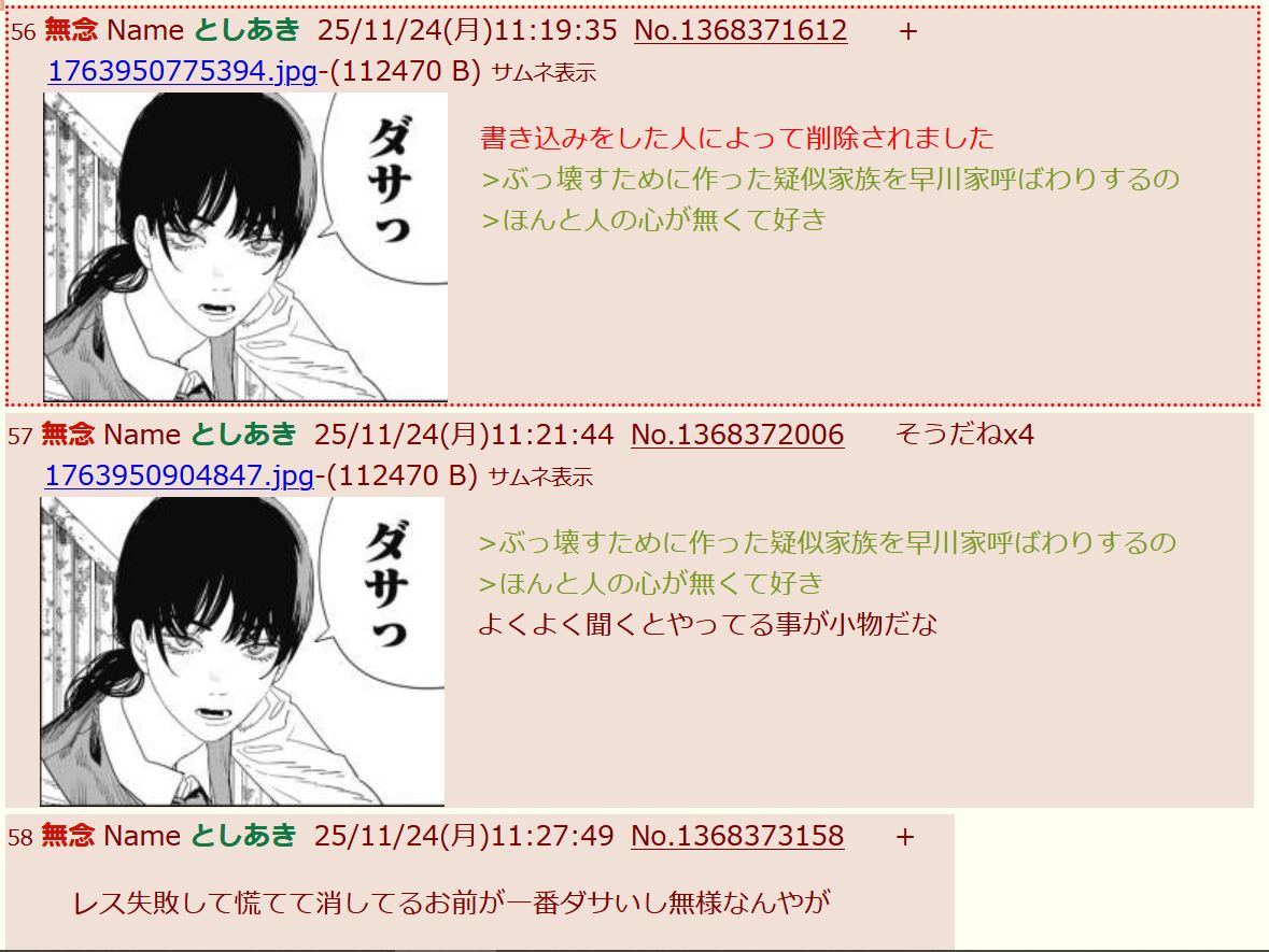 | … | 57無念Nameとしあき25/11/24(月)11:21:44No.1368372006そうだねx5 1763950904847.jpg-(112470 B) >ぶっ壊すために作った疑似家族を早川家呼ばわりするの |