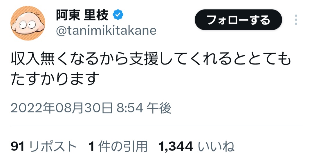 | … | 26無念Nameとしあき なの25/11/24(月)11:21:59 IP:182.164.*(eonet.ne.jp)No.1368372059そうだねx2>@tanimikitakaneは、イラストレーターの阿東里枝氏が運営するアカウントで、日常の体調不良や趣味の話題をユーモラスな漫画やテキストで共有し、21万以上のフォロワーを集めています。睡眠サイクルや胃腸炎などの個人的な悩みをオープンに語り、VTuber周防パトラや声優野沢雅子へのファン心を垣間見せます。なりすましアカウントへの注意喚起も定期的に行っています。 |