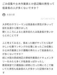 女さん 気づく「ごみ収集や土木作業員とか親がやってたら恥ずかしい底辺職の男性って低身長の人が多くないですか?」 |